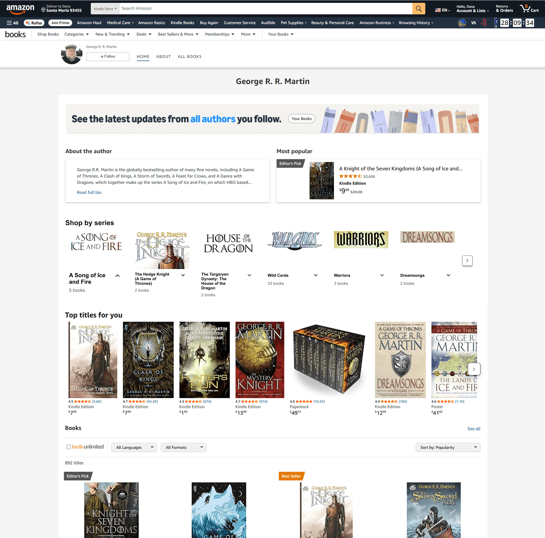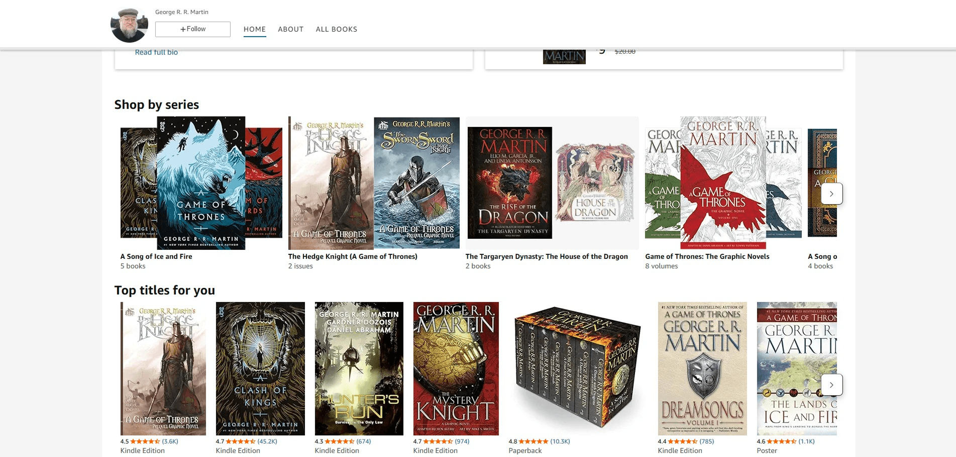 The current UI design for author pages on Amazon.com are visually crowded. Specifically the section of shopping by series. This can make the experience confusing for the potential readers.